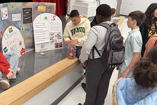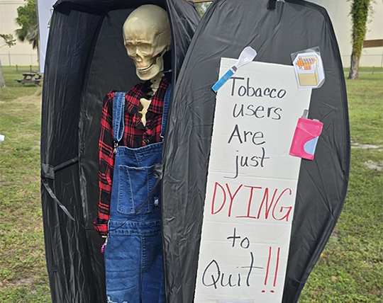 On October 30, 2025, the Dixie County Middle/High School SWAT Club hosted a Recruitment Event during all three lunch periods at DCMHS. The club set up a themed display, “Choose Treats, Not Tricks,” featuring headstones and poster boards sharing facts about tobacco, vaping, and emerging nicotine products. The display highlighted how the tobacco and nicotine industry targets youth by using candy, fruit, and mint-flavored products to encourage addiction.